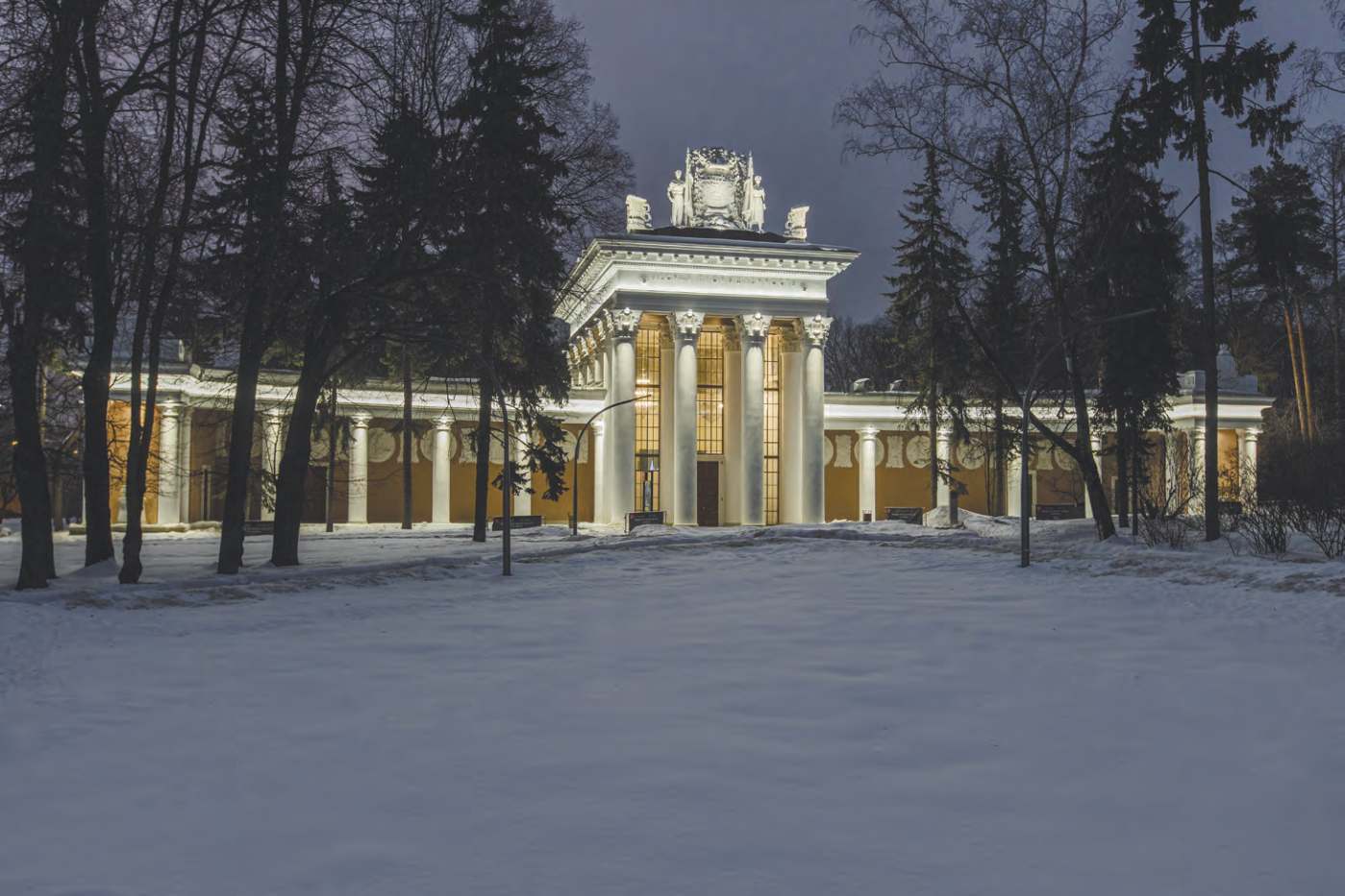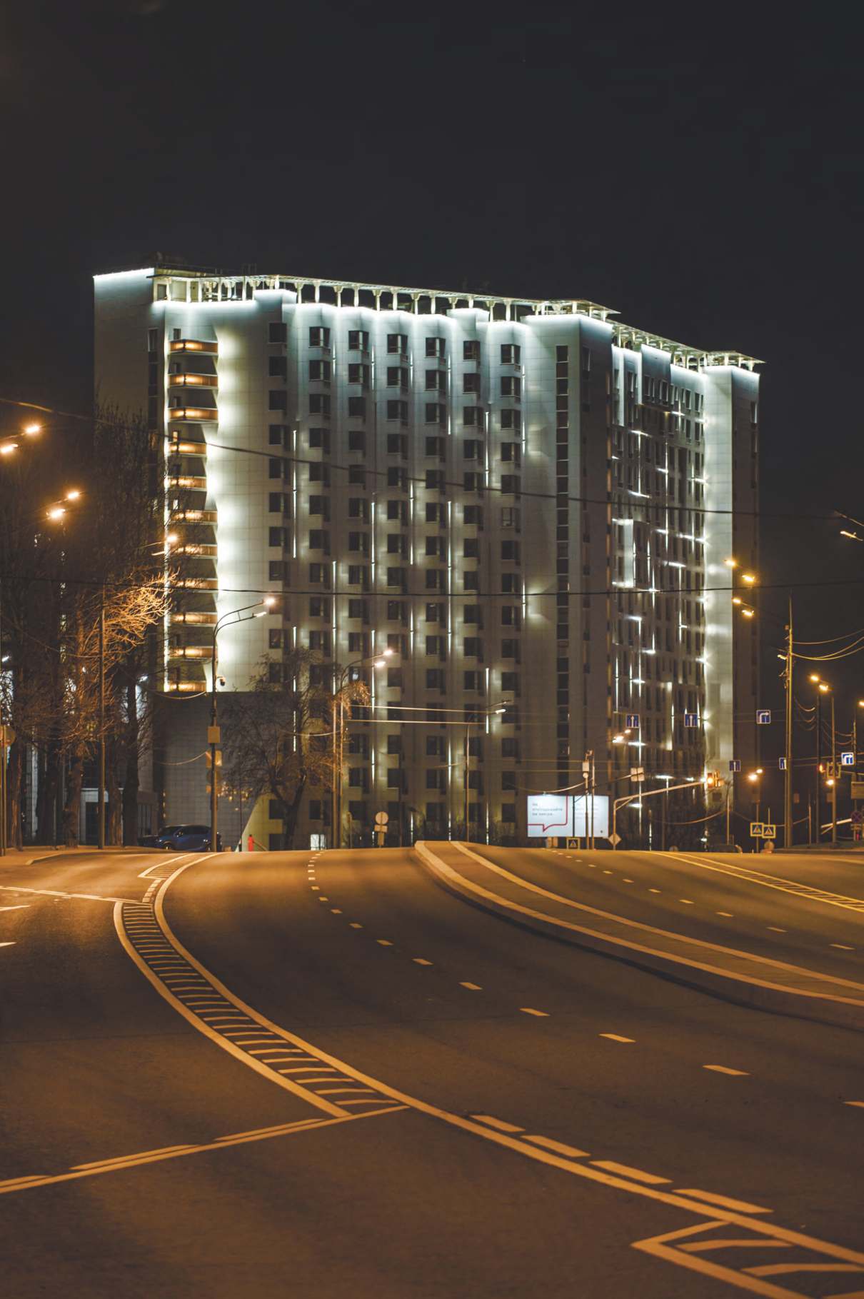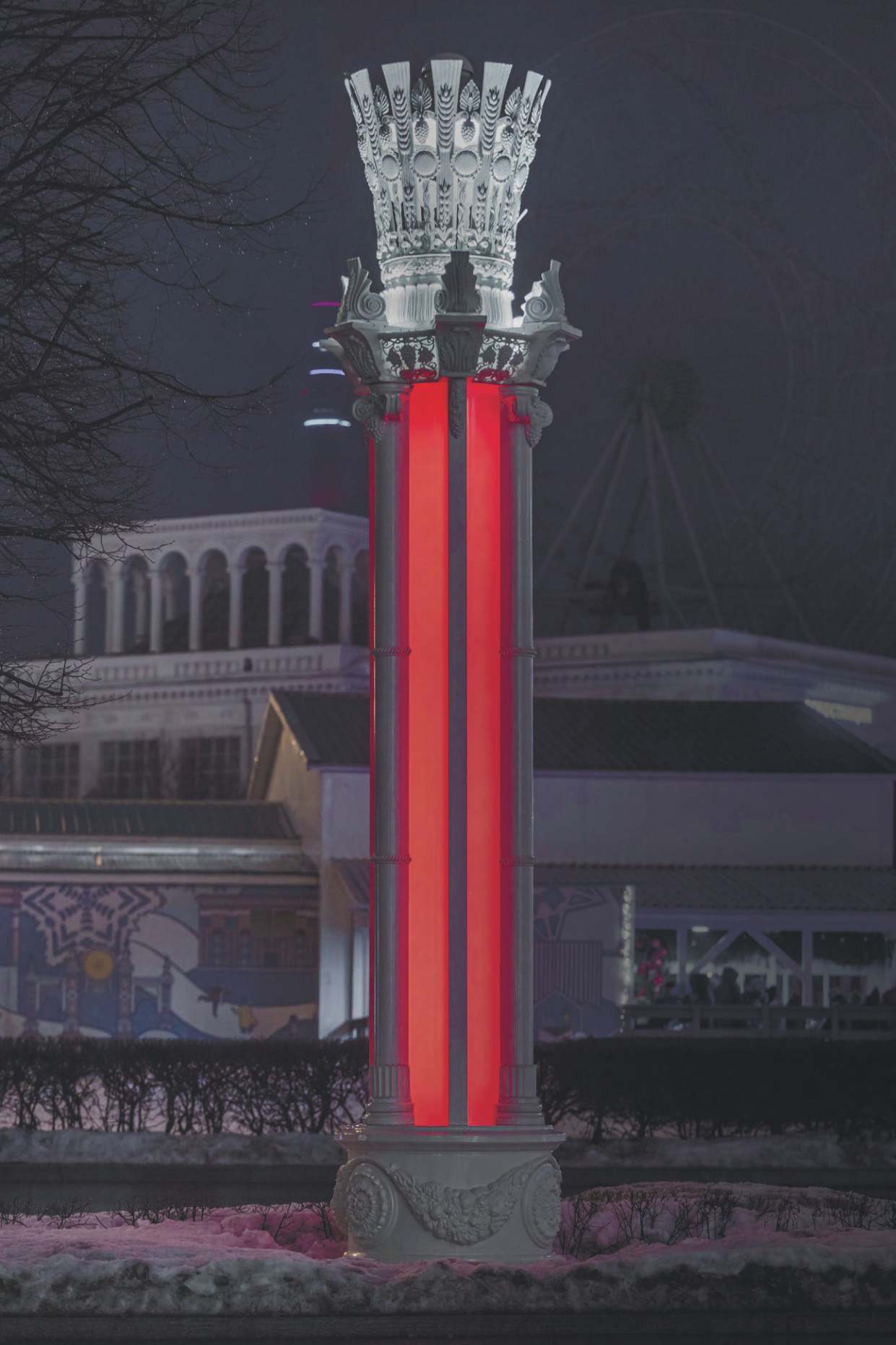 Суммарно почти 500 акцентных светильников выделяют верхние части колонн.