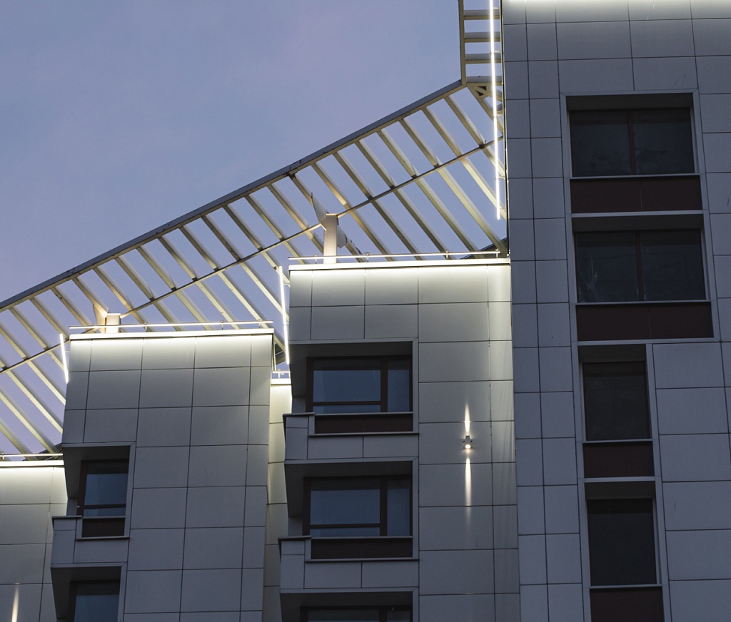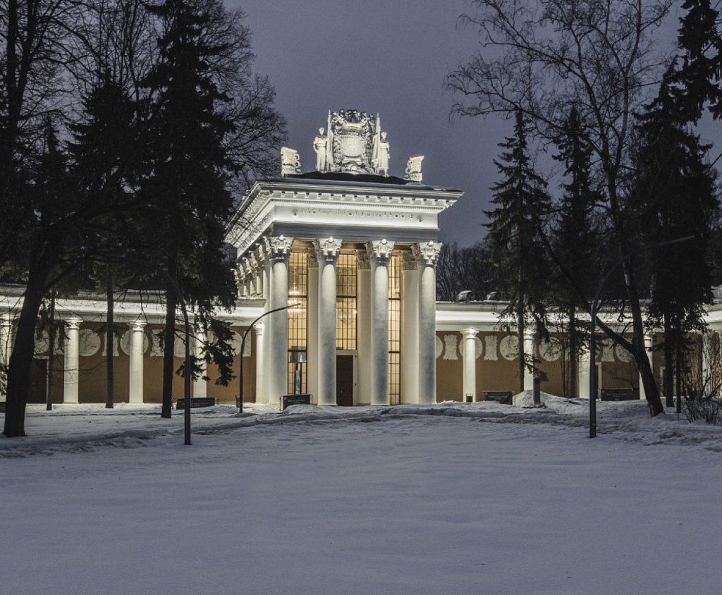 Выбранная цветовая палитра подсветки прекрасно подчёркивает статус МГИМО и идеально встраивает кампус в архитектурный ансамбль.